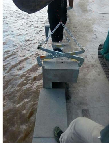 由于此防護(hù)欄距離較長(zhǎng)3公里,高度為1.2米,所需石材較多,故而使用石材吊夾替代人工上升下降起吊石材。圖中F-24石材吊夾正在吊裝石材。