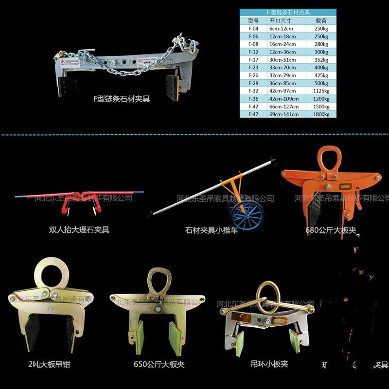 大理石板吊具是一種新型實用的石材輔助工具,它包括吊環、拉桿、吊臂、夾板等。石材夾具主要用于石材生產過程中的輔助工作。